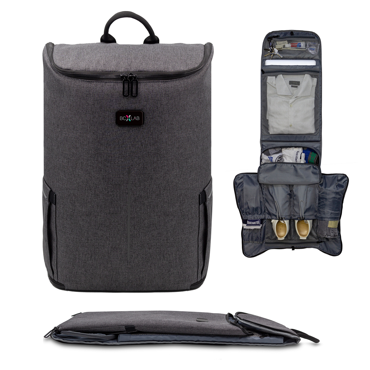 - Compartments for clothes, shoes, toiletries, laptop, tech accessories, etc.