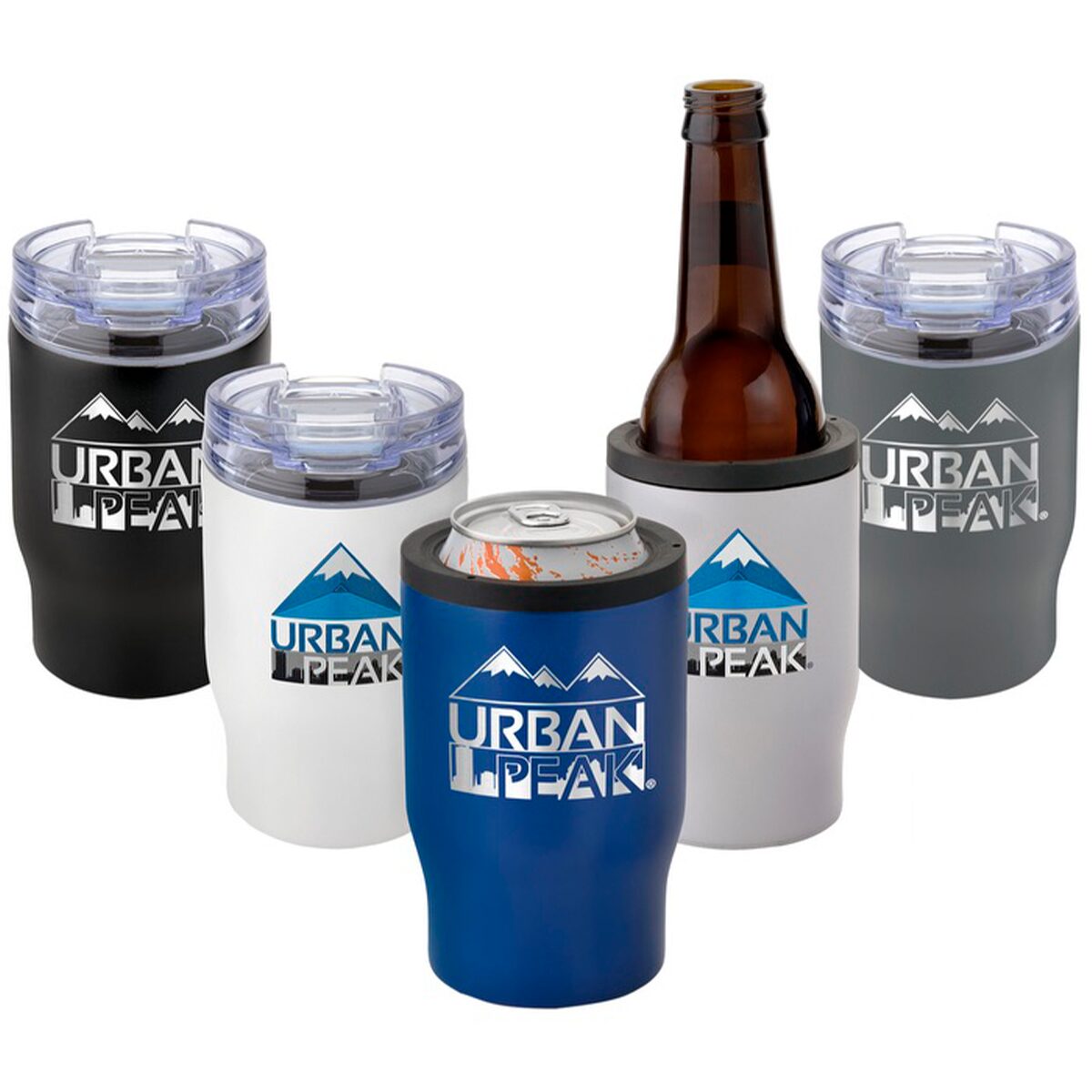 - Transitions between poured drink insulated tumbler, 12 oz can cooler, and 12 oz beer bottle cooler